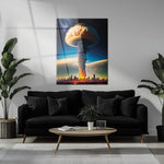 Showcase raw power and surrealism with our Apocalyptic Explosion UV Glass Wall Art. Featuring a dramatic mushroom cloud erupting over a futuristic city skyline, this artwork captures a haunting moment of destruction and beauty. The cinematic lighting and intense colors make it a standout piece for lovers of sci-fi, dystopian themes, or bold contemporary décor.