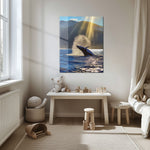 Celebrate the power and elegance of nature with our Majestic Whale Breach UV Glass Wall Art. Captured mid-air against the glowing sunrise and misty mountains, this striking piece showcases a humpback whale leaping from the sea, symbolizing freedom and strength.
