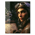 Celebrate the spirit of exploration with our Vintage Astronavigator UV Glass Wall Art. This captivating artwork features a determined female pilot in retro aviation gear, poised beside an antique star chart and telescope under a starlit sky. Her gaze, focused and bold, evokes adventure, discovery, and a touch of mystery.